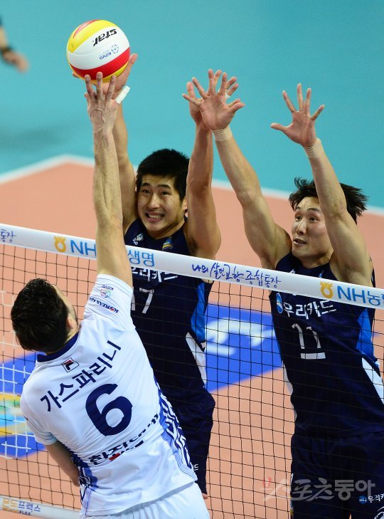 14일 서울 장충체육관에서 ‘2016-2017 NH농협 V리그 남자부’ 우리카드와 대한항공의 경기가 열렸다. 2세트 우리카드 박상하와 최홍석(오른쪽)이 대한항공 가스파리니의 스파이크 공격을 막기 위해 점프하고 있다.