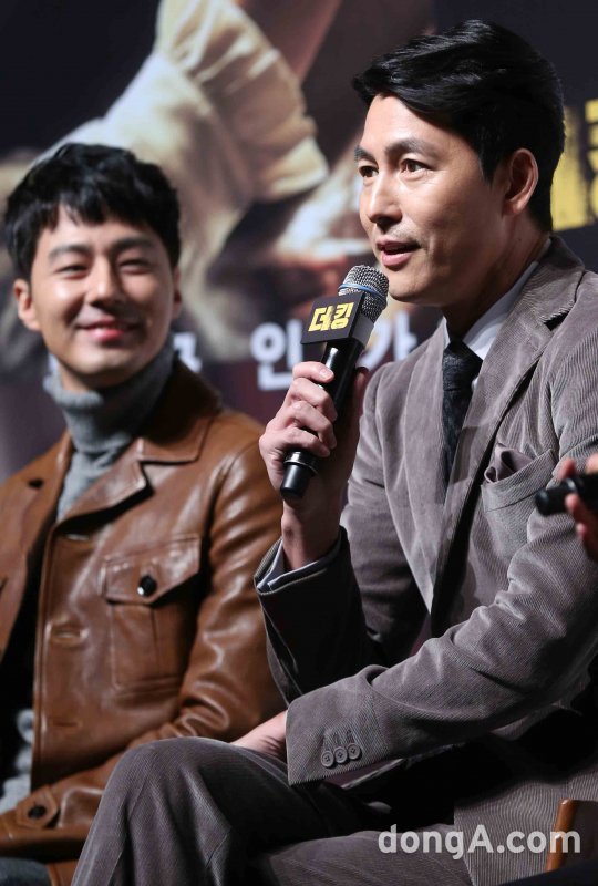 배우 정우성(오른쪽)이 15일 오전 서울 강남구 한 멀티플렉스관에서 열린 영화 '더킹' 제작보고회에서 인사말을 하고 있다.