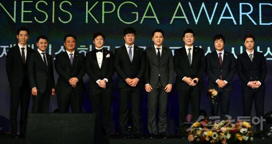 15일 서울 남산 하얏트호텔에서 ‘제너시스 한국프로골프대상(KPGA) 시상식 2016’이 열렸다. KPGA 챔피언스클럽에 오른 최진호(왼쪽부터), 박상현, 모중경, 이상희, 이상엽, 김준성, 주흥철, 이경훈, 이형준이 카메라를 향해 포즈를 취하고 있다.