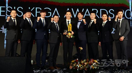 15일 서울 남산 하얏트호텔에서 ‘제너시스 한국프로골프대상(KPGA) 시상식 2016’이 열렸다. KPGA 대상을 수상한 최진호(가운데) 프로가 김준성(왼쪽부터), 이상엽, 이지훈, 박상현, 변진재, 윤정호, 주흥철, 이형준, 이창우가 기념촬영을 하고 있다.