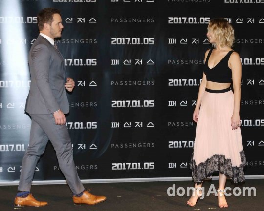 이날, 제니퍼 로렌스와 크리스 프랫이 '패신저스' 홍보를 위해 내한했다.