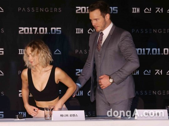 이날, 제니퍼 로렌스와 크리스 프랫이 '패신저스' 홍보를 위해 내한했다.