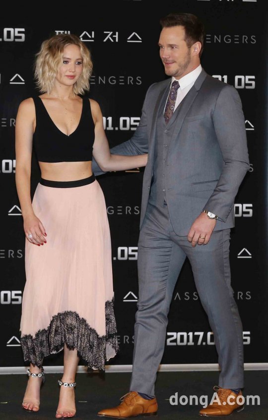 이날, 제니퍼 로렌스와 크리스 프랫이 '패신저스' 홍보를 위해 내한했다.