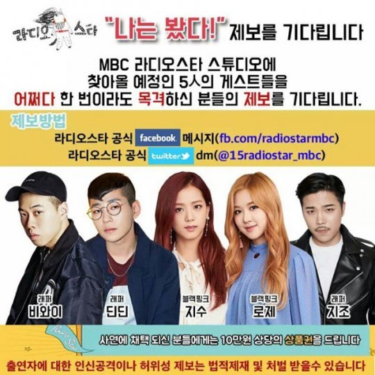 MBC '라디오스타'는 공식사이트를 통해 블랙핑크 지수와 로제의 출연 소식을 전했다. 두 사람은 래퍼 비와이, 래퍼 딘딘, 래퍼 지조와 함께 예능 호흡을 맞춘다.