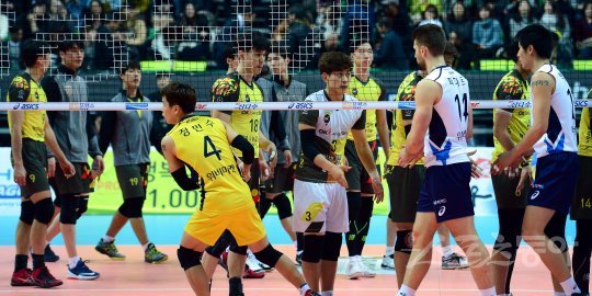 18일 안산상록수체육관에서 열린 ‘NH농협 2016~2017 V리그’ 남자부 우리카드와 OK저축은행 경기에서 세트스코어 0-3을 패하며 7연패에 빠진 OK저축은행 선수들이 인사를 나누고 있다.