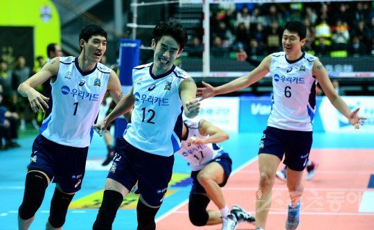 18일 안산상록수체육관에서 열린 ‘NH농협 2016~2017 V리그’ 남자부 우리카드와 OK저축은행 경기에서 우리카드 신으뜸이 공격 득점에 성공한 후 기뻐하고 있다.