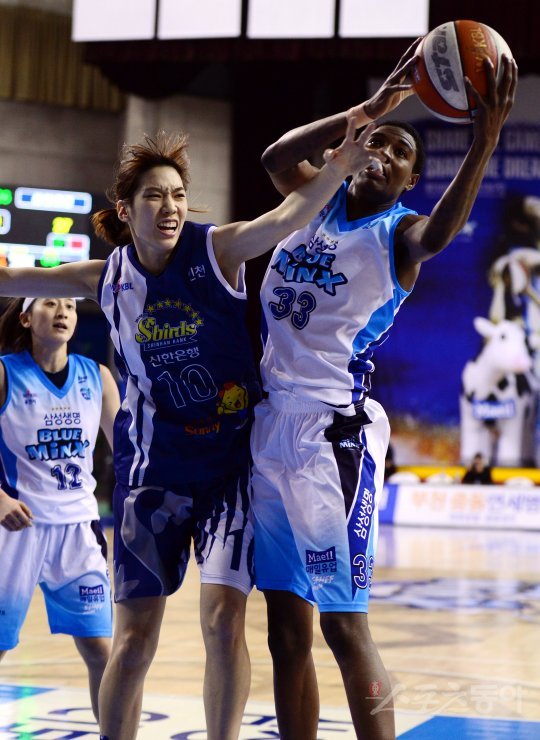 18일 경기도 용인실내체육관에서 열린 ‘삼성생명 2016-2017 여자프로농구’ 용인 삼성생명과 인천 신한은행의 경기에서 삼성생명 하워드와 신한은행 양지영이 리바운드를 다투고 있다.