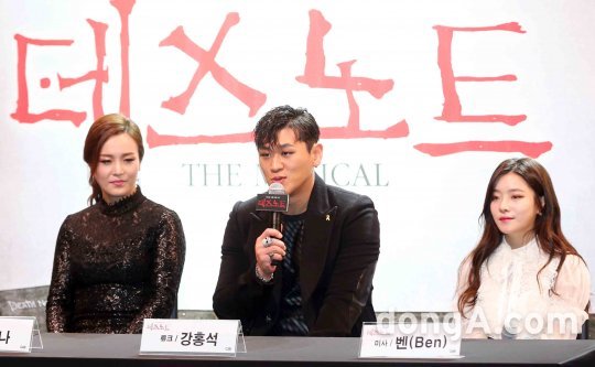 뮤지컬 배우 박혜나, 강홍석, 벤(왼쪽부터)이 19일 오후 서울 잠실 롯데콘서트홀에서 열린 뮤지컬 데스노트 제작발표회에 참석해 인사말을 하고 있다.
