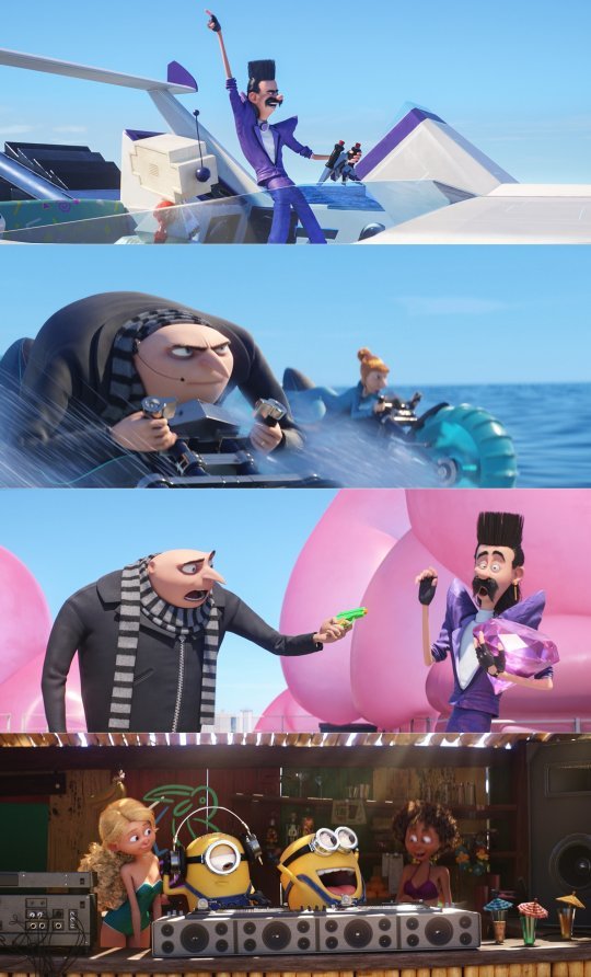 이번에 공개한 1차 예고편은 여전히 악당 기질을 보이는 그루와 루시가 그들의 심기를 건드리며 지나가는 차를 완전히 박살내면서 시작한다. 무엇보다 어깨에 뽕을 잔뜩 넣고 정체불명의 괴물로 오해까지 받는 올드한 80년대 스타일을 갖춘 완전히 새로운 악당의 등장이 호기심을 자극한다. 그루가 쏜 총이 딸들의 장난감 총으로 밝혀진 후, 난데없는 댄스 배틀을 펼치는 악당과 풍선껌으로 공격 받은 그루의 모습이 웃음을 자아낸다. 특히 예고편의 마지막에 그루를 지켜보던 미니언즈들의 등장이 반가움을 더하며 영화에 대한 기대를 높인다.