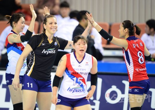 20일 경북 김천실내체육관에서 ‘2016-2017 NH농협 V리그 여자부’ 도로공사와 GS칼텍스의 경기가 열린다. 경기를 앞두고 도로공사의 새로운 외국인 선수 힐러리 헐리(왼쪽 두 번째)가 훈련 중 임명옥과 하이파이브를 하고 있다.