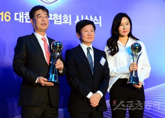 20일 서울 용산 백범 김구 기념관에서 ‘2016 대한축구협회 시상식’이 열렸다. 올해의 선수로 선정된 스완지시티 기성용(대리수상 기영옥), 현대제철 김정미가 정몽규 축구협회장과 기념촬영을 하고 있다.