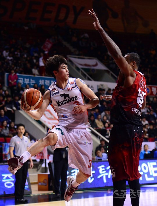 20일 안양실내체육관에서 열린 ‘2016~2017 KCC 프로농구’ 전자랜드와 KGC인삼공사 경기에서 전자랜드 김지완이 KGC인삼공사 사이먼의 수비를 피해 패스를 하고 있다.