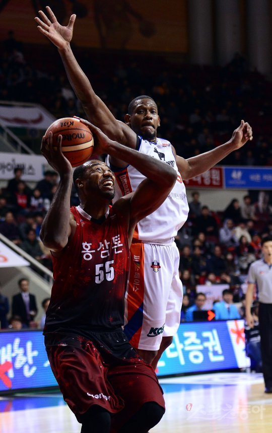 20일 안양실내체육관에서 열린 ‘2016~2017 KCC 프로농구’ 전자랜드와 KGC인삼공사 경기에서 KGC인삼공사 사이먼이 전자랜드 빅터의 수비를 뚫고 골밑을 공격하고 있다.