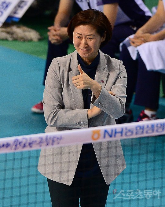 21일 경기도 화성종합실내체육관에서 ‘2016-2017 NH농협 V리그’ 여자부 IBK기업은행과 흥국생명의 경기가 열렸다. 1세트 흥국생명 박미희 감독이 득점에 성공한 이재영을 향해 엄지손가락을 내밀며 축하해주고 있다.