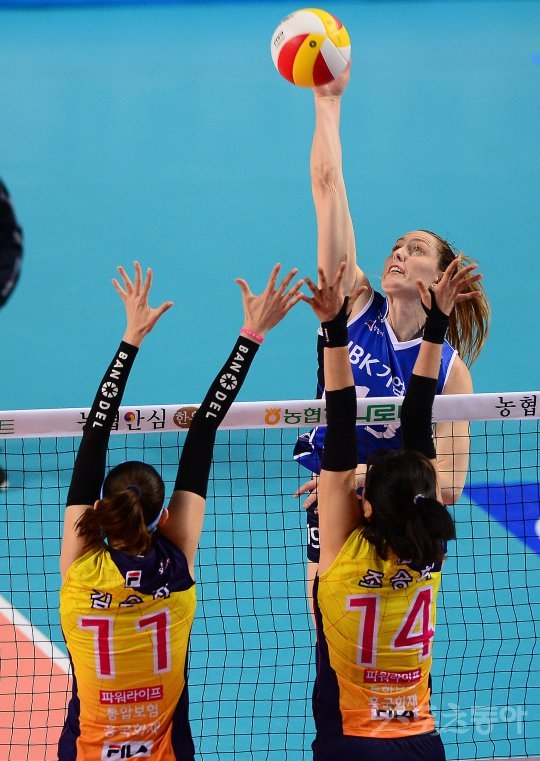 21일 경기도 화성종합실내체육관에서 ‘2016-2017 NH농협 V리그’ 여자부 IBK기업은행과 흥국생명의 경기가 열렸다. 1세트 IBK기업은행 리쉘이 흥국생명 블로커의 수비를 피해 스파이크 공격을 하고 있다.