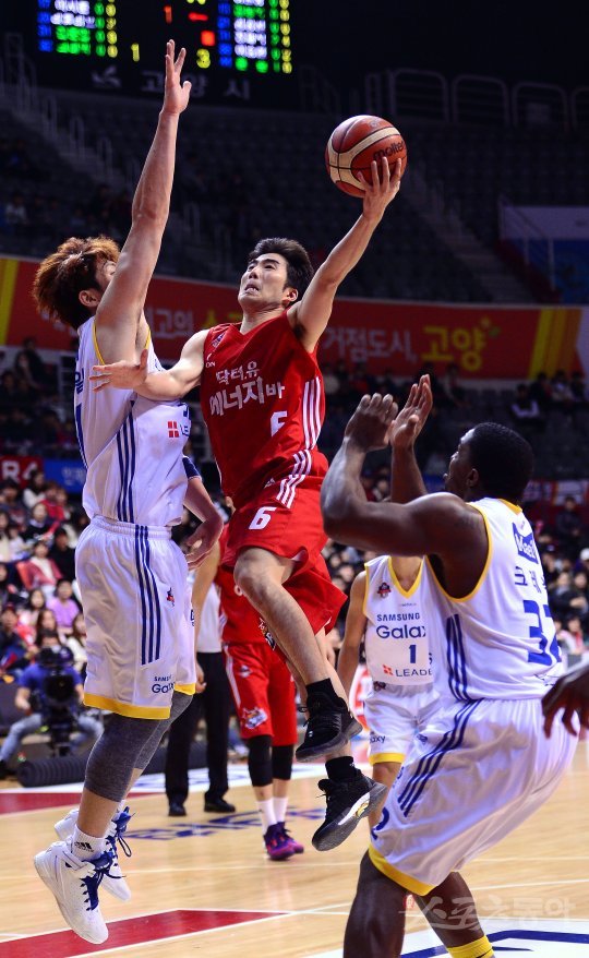 21일 고양실내체육관에서 열린 ‘2016~2017 KCC 프로농구’ 고양오리온과 서울삼성 경기에서 오리온 정재홍이 삼성의 수비를 뚫고 골밑슛을 하고 있다.