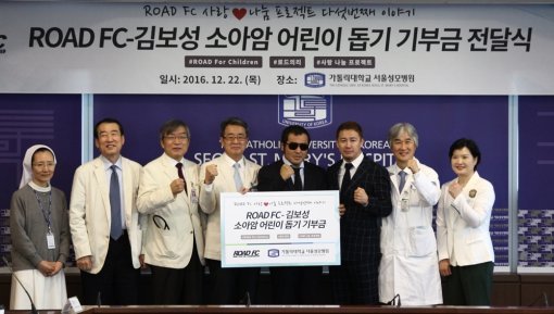22일 오전 11시 서울 서초구 반포동에 위치한 서울성모병원에서 진행된 기부금 전달식에 ROAD FC (로드FC) 정문홍 대표와 김보성, 강무일 가톨릭중앙위료원장, 승기배 서울성모병원장, 김학기 서울성모병원 어린이학교장 등 10여명이 참석했다.