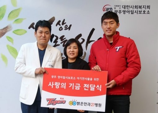 KIA타이거즈는 22일 투수 홍건희, 밝은안과21병원 김근오 원장 등과 함께 광주시 동구 소태동에 위치한 대한사회복지회 영아일시보호소를 찾아 ‘사랑의 기금’ 등을 전달했다.