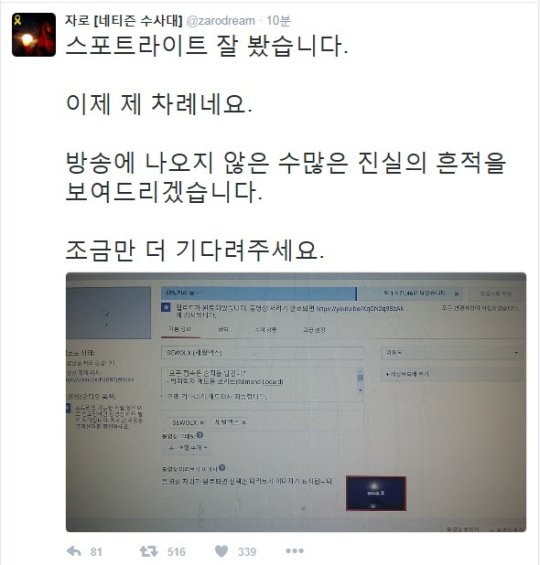 세월호 사고를 재조명하는 다큐멘터리 ‘세월X’의 제작자이자 네티즌 수사대로 유명한 자로가 '이규연의 스포트라이트' 시청 소감을 남겼다.