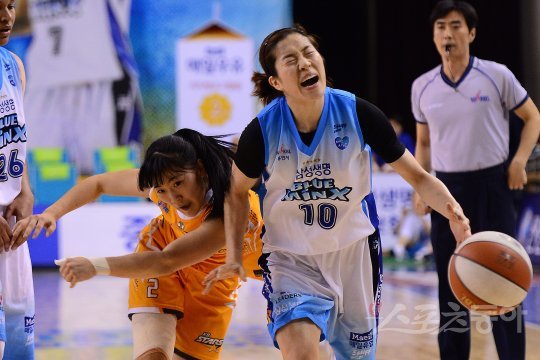 1쿼터 삼성생명 고아라가 돌파를 시도하는 중 KB스타즈 김현아에게 파울을 얻어내고 있다.