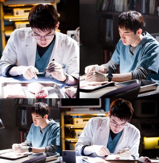 유연석이 지적 포스로 주변을 압도하고 있는 ‘봉합술 삼매경’ 장면은 지난 23일 경기도 파주에 있는 세트에서 진행됐다. 유연석은 소품으로 세팅된 돼지비계 등을 보면서 신기한 얼굴을 하다가도, 이내 덤덤하게 만지면서 봉합 연습을 준비했다.