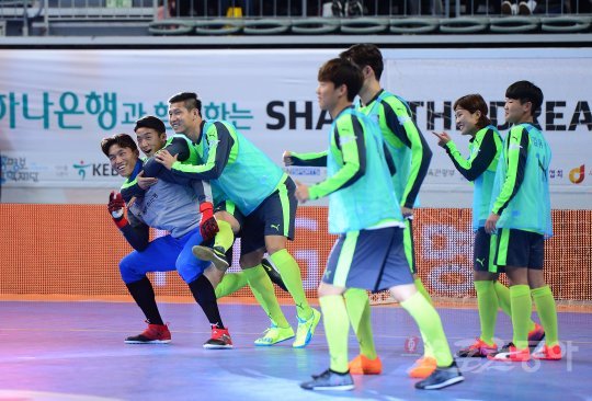 27일 서울 장충체육관에서 홍명보 자선경기 ‘SHARE THE DREAM FOOTBALL MATCH 2016’이 열렸다. 희망팀 선수들이 골을 넣은 후 마네킹 세리머니를 하고 있다. ‘청년들에게 희망을, 소아암 환우들에게 사랑을’이란 취지로 27일 오후 7시 장충체육관에서 열릴 이 경기는 K리거들과 중국·일본·독일 등지의 해외파 및 여자대표, 연예인이 함께 하며 풋살 형태로 치러진다. 수익금 대부분은 소아암 환우들에게 기부되며 다문화가정과 장애우, 청년실업 해소를 위해서도 쓰인다.