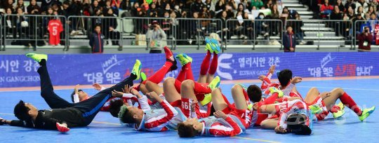 27일 서울 장충체육관에서 홍명보 자선경기 ‘SHARE THE DREAM FOOTBALL MATCH 2016’이 열렸다. 사랑팀 선수들이 단체로 볼링핀 세리머니를 펼치고 있다. ‘청년들에게 희망을, 소아암 환우들에게 사랑을’이란 취지로 27일 오후 7시 장충체육관에서 열린 이 경기는 K리거들과 중국·일본·독일 등지의 해외파 및 여자대표, 연예인이 함께 하며 풋살 형태로 치러진다. 수익금 대부분은 소아암 환우들에게 기부되며 다문화가정과 장애우, 청년실업 해소를 위해서도 쓰인다.