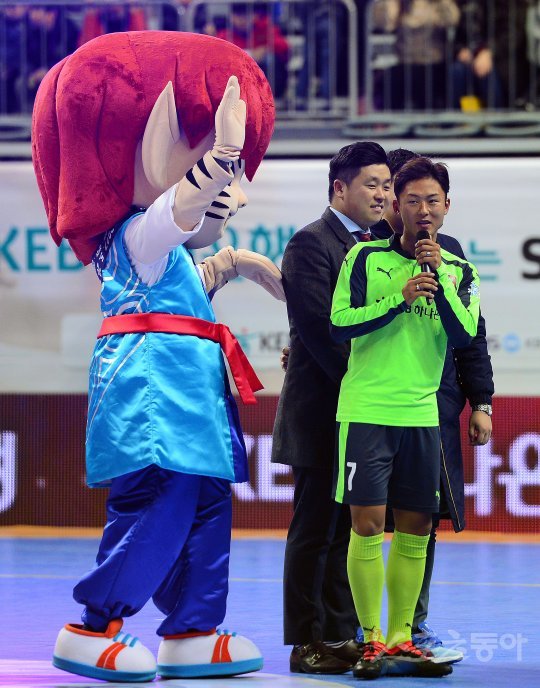 27일 서울 장충체육관에서 홍명보 자선경기 ‘SHARE THE DREAM FOOTBALL MATCH 2016’이 열렸다. 희망팀 이승우가 골을 넣은 후 2017년 열리는 U-20월드컵 마스코트 차오르미와 함께 인사말을 하고 있다. ‘청년들에게 희망을, 소아암 환우들에게 사랑을’이란 취지로 27일 오후 7시 장충체육관에서 열린 이 경기는 K리거들과 중국·일본·독일 등지의 해외파 및 여자대표, 연예인이 함께 하며 풋살 형태로 치러진다. 수익금 대부분은 소아암 환우들에게 기부되며 다문화가정과 장애우, 청년실업 해소를 위해서도 쓰인다.