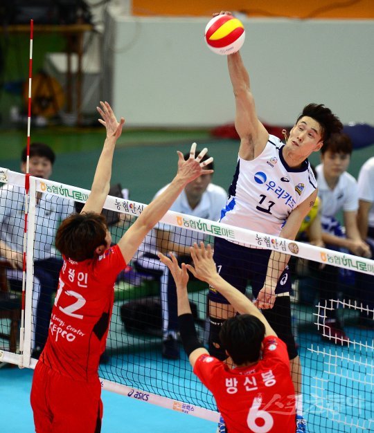 27일 수원실내체육관에서 열린 ‘NH농협 2016~2017 V리그’ 남자부 우리카드와 한국전력 경기에서 우리카드 최홍석이 한국전력의 블로킹 사이로 스파이크 공격을 하고 있다.