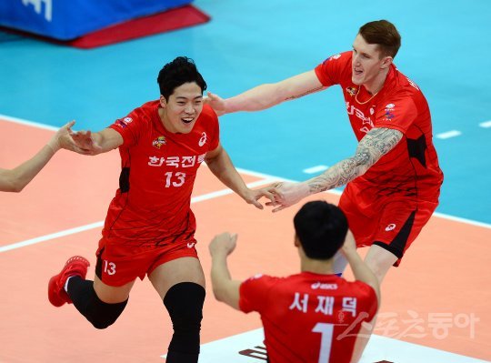 27일 수원실내체육관에서 열린 ‘NH농협 2016~2017 V리그’ 남자부 우리카드와 한국전력 경기에서 한국전력 정주형이 블로킹 득점에 성공한 후 환호하고 있다.