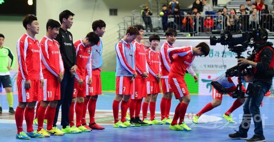 27일 서울 장충체육관에서 홍명보 자선경기 ‘SHARE THE DREAM FOOTBALL MATCH 2016’이 열렸다. 사랑팀 선수들이 골을 넣은 후 일렬로 서서 익살스러운 세리머니를 펼치고 있다. ‘청년들에게 희망을, 소아암 환우들에게 사랑을’이란 취지로 27일 오후 7시 장충체육관에서 열린 이 경기는 K리거들과 중국·일본·독일 등지의 해외파 및 여자대표, 연예인이 함께 하며 풋살 형태로 치러진다. 수익금 대부분은 소아암 환우들에게 기부되며 다문화가정과 장애우, 청년실업 해소를 위해서도 쓰인다.