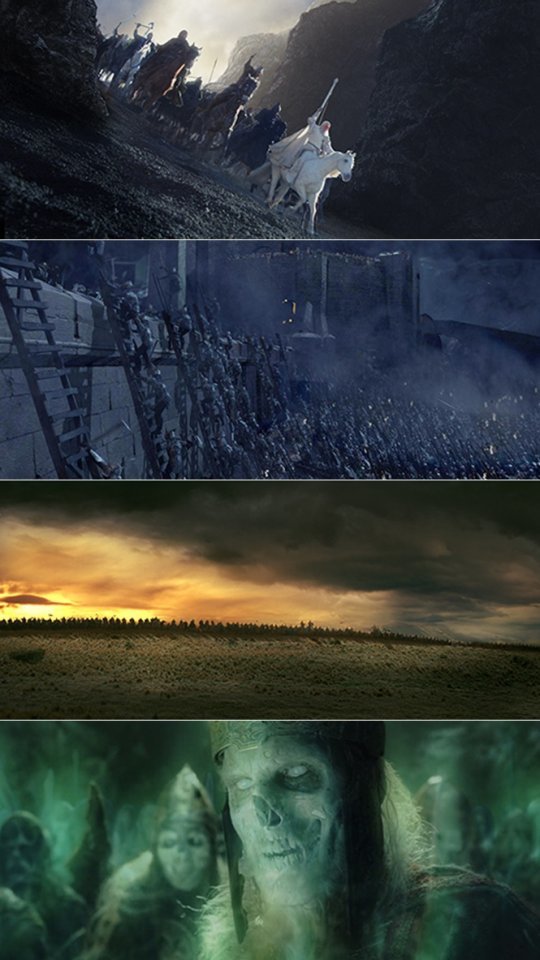 ‘아라곤과 유령부대 전투’씬은 다시 봐도 전율이 흐를 정도로 많은 관객들에게 카타르시스를 선사한 베스트 오브 베스트 장면이다. 로한의 기마대의 병력지원에도 사우론의 전투 코끼리 부대에게 속수무책 당해 승기가 꺾여가고 있을 때 아라곤이 자신의 유령부대와 함께 나타나 기습돌격으로 전세를 뒤엎는 이 전투 명장면은 ‘반지의 제왕’ 팬이라면 빠지지 않고 언급하는 전투 중 하나. 특히 오크의 배에서 내리며 여유로운 모습을 보이는 아라곤과 갑자기 나타난 유령부대를 보고 당황해하는 오크의 상반된 모습이 관람포인트로, 이글거리는 눈빛으로 검을 뽑아든 아라곤 뒤로 도끼를 든 드워프, 활시위를 당기는 레골라스와 함께 나타난 초록물결의 유령부대는 이번에도 어김없이 관객들의 마음을 사로잡을 것으로 기대를 높인다.