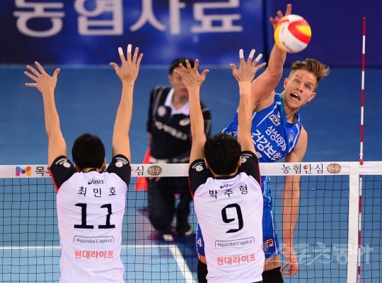 28일 천안 유관순체육관에서 ‘2016-2017 NH농협 V리그’ 현대캐피탈과 삼성화재의 네 번째 ‘V-클래식 매치’가 열렸다. 2세트 삼성화재 타이스가 현대캐피탈 블로커의 수비를 앞에 두고 스파이크 공격을 하고 있다.