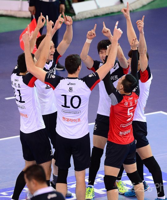 28일 천안 유관순체육관에서 ‘2016-2017 NH농협 V리그’ 현대캐피탈과 삼성화재의 네 번째 ‘V-클래식 매치’가 열렸다. 1세트 득점에 성공한 현대캐피탈 선수들이 특유의 세리머니를 펼치고 있다.