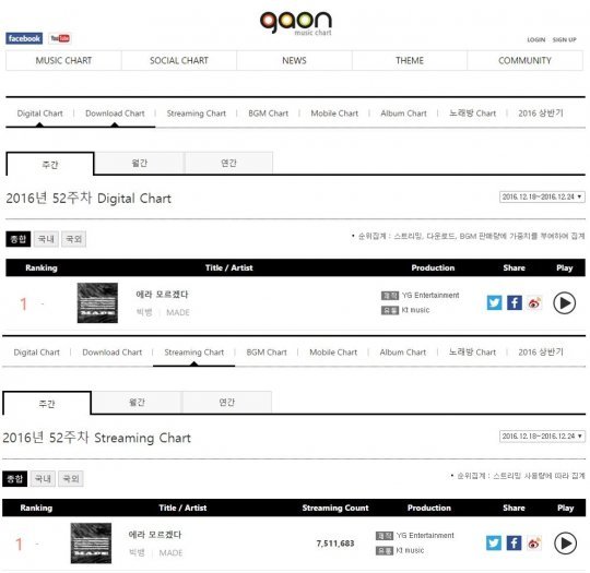 29일 가온차트 집계에 따르면 빅뱅의 정규 3집 ‘MADE THE FULL ALBUM’의 더블 타이틀곡 중 하나인 ‘에라 모르겠다’는 52주차 가온차트 디지털 종합 차트와 온라인 스트리밍 차트에서 1위를 차지해 2관왕에 올랐다.