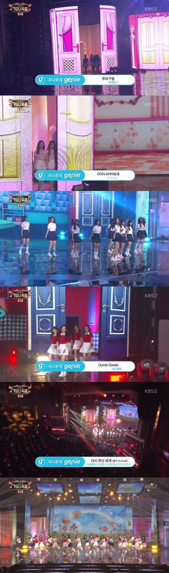 29일 오후 방송된 ‘2016 KBS 가요대축제’에서는 여자친구, 아이오아이(I.O.I), 트와이스, 레드벨벳이 무대위에서 소녀시대의 ‘다시 만난 세계’를 부르는 장면이 그려졌다.