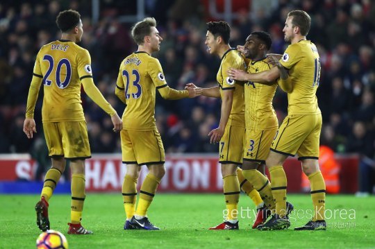 토트넘 손흥민(왼쪽 3번째)이 29일(한국시간) 세인트 메리즈 스타디움에서 벌어진 잉글랜드 프리미어리그 2016~2017시즌 18라운드 사우샘프턴과의 원정경기 후반 40분 3-1로 달아나는 쐐기골을 터트린 뒤 동료들과 기쁨을 나누고 있다. 사진=ⓒGettyimages이매진스