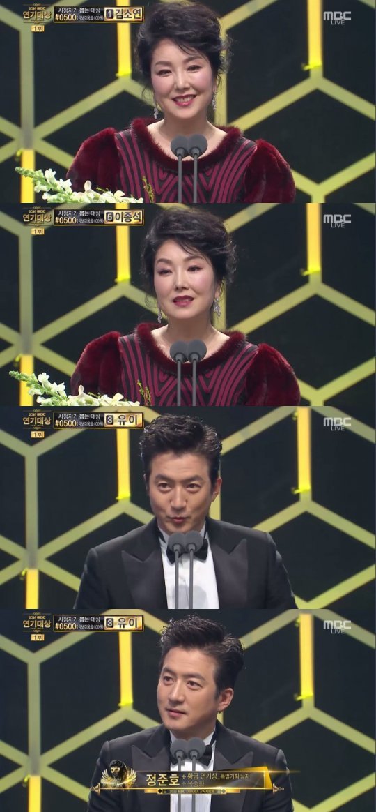 이어 정준호는 “황금 연기상이라는 게 드라마를 찍을 때 선, 후배 분들을 잘 화합하게 하고 중간에서 큰 힘이 돼줄 수 있는 중간 연기자 역할을 잘 하라고 주신 것 같다. 100여명의 스태프들이 각자 임무를 충실히 해 명품 드라마가 탄생이 된다. 95년도에 신인상을 받고, 돌아가신 최진실 선배님과 출연한 걸로도 상을 받았다”고 당시를 회상해 눈길을 끌었다.