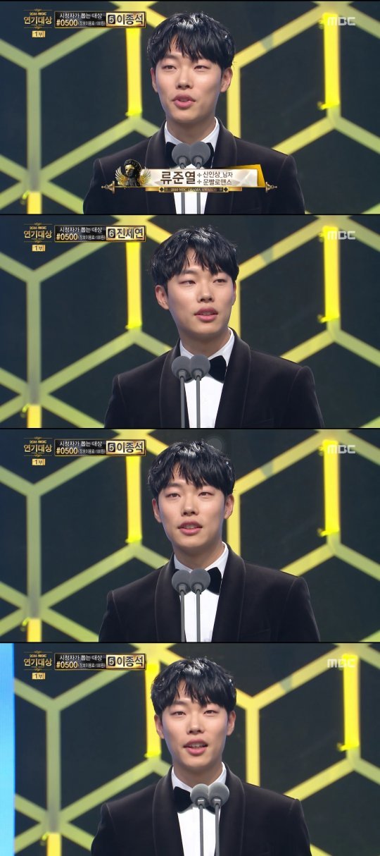 류준열은 “연말에 혼자 있는 것보다 다같이 즐기려고 참석한 자리였는데, 소중한 상 주셔서 정말 감사드린다. 감독님과 작가님, 동료배우, 스태프분들에게 감사하다고 전하고 싶다. 한해 동안 힘든 일도 많았지만 그사이에서 환한 희망을 우리 봤던 것 같다. 그 희망과 사랑 잊지 말고 다같이 행복했으면 좋겠다”고 소감을 전했다.