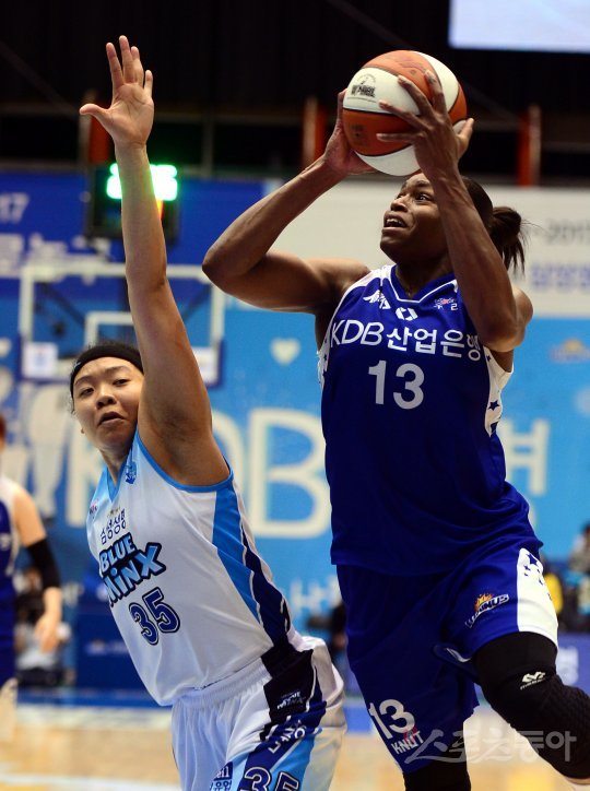 1일 경기도 구리실내체육관에서 열린 ‘삼성생명 2016-2017 여자프로농구’ 구리 KDB생명과 용인 삼성생명의경기에서 KDB생명 크리스마스가 삼성생명 김한별의 수비를 피해 슛을 쏘고 있다.