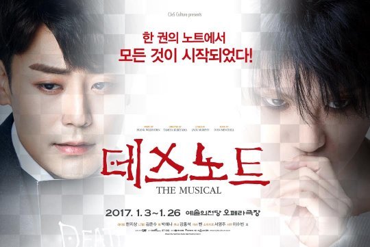 한지상, 김준수, 박혜나, 강홍석, 벤(BEN), 서영주 등 최고의 캐스팅 라인업과 2015년에 이어 거장 연출가 쿠리야마 타미야와 작곡가 프랭크 와일드혼이 함께하며 2017년 최고의 기대작으로 관심을 모으고 있는 뮤지컬 '데스노트'는 1월 3일부터 1월 26일까지 예술의 전당 오페라극장에서 공연되며, 하나티켓, 인터파크, 예스24에서 예매 가능하다.