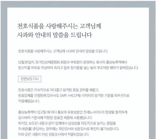 천호식품은 3일 "천호식품을 사랑해주시는 고객님께 사과와 안내의 말씀을 드린다"는 제목의 공지문을 홈페이지를 통해 게재했다.
