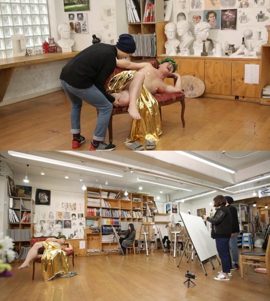 김숙은 화실에 도착한 후에는 다짜고짜 윤정수에게 “누드모델을 해야되니 옷을 벗어라”고 요구했다. 뿐만 아니라 화실을 찾은 사람들의 시선에 당황한 윤정수는 필사적으로 옷을 사수했다. 하지만 결국엔 모델료를 톡톡히 쳐주겠다는 김숙의 말에 낚여 만면에 인상을 잔뜩 쓰고 생애 최초로 누드모델에 도전하게 됐다.