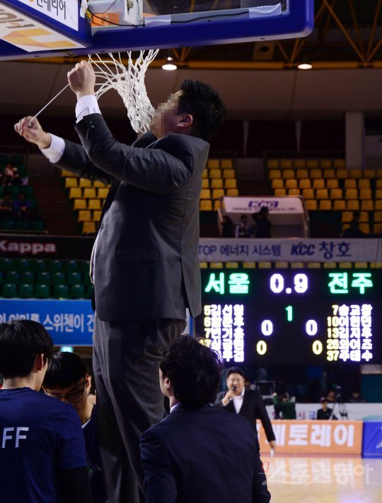 3일 전북 군산 월명체육관에서 열린 ‘2016-2017 KCC 프로농구’ 전주 KCC와 서울 SK의 경기에서 골대 그물망 교체로 인해 경기 시작이 지연되고 있다.