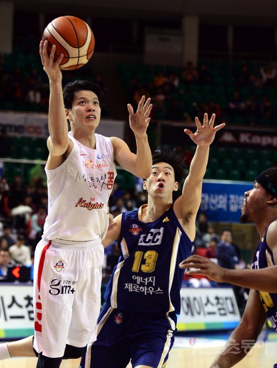 3일 전북 군산 월명체육관에서 열린 ‘2016-2017 KCC 프로농구’ 전주 KCC와 서울 SK의 경기에서 SK 김선형이 KCC 김지후의 수비를 피해 슛을 쏘고 있다.