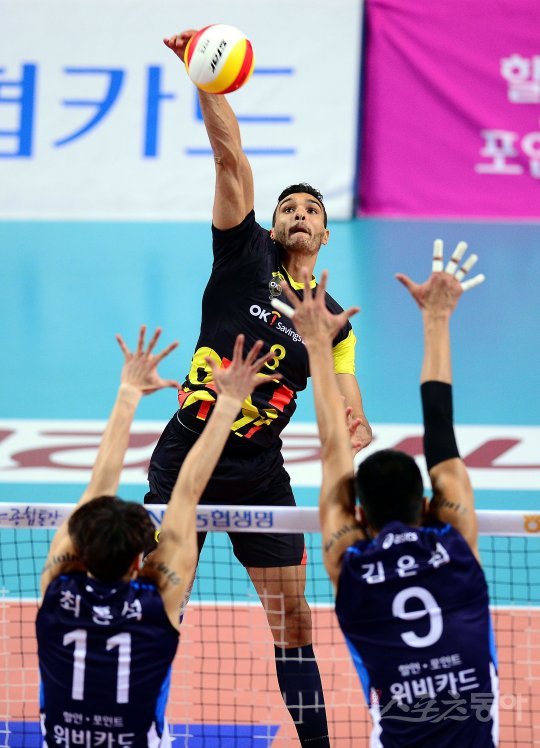 3일 서울 장충체육관에서 열린 ‘NH농협 2016~2017 V리그’ 남자부 OK저축은행과 우리카드 경기에서 OK저축은행 모하메드가 우리카드의 블로킹 사이로 스파이크 공격을 하고 있다.