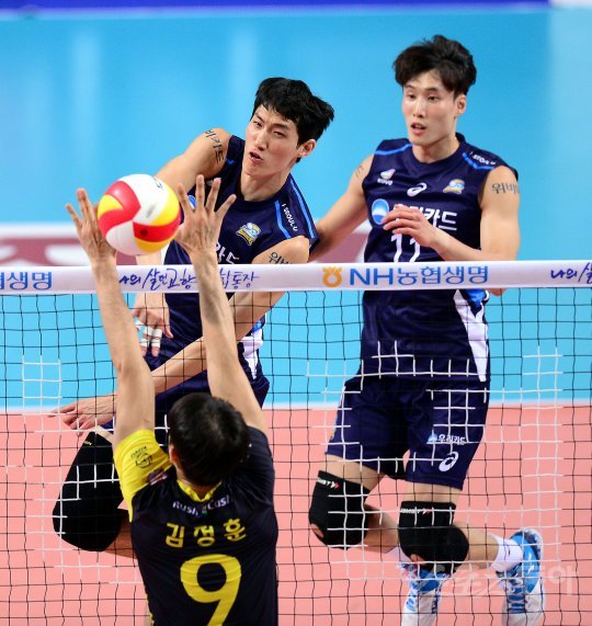 3일 서울 장충체육관에서 열린 ‘NH농협 2016~2017 V리그’ 남자부 OK저축은행과 우리카드 경기에서 우리카드 박진우와 최홍석이 OK저축은행의 블로킹 사이로 스파이크 공격을 하고 있다.