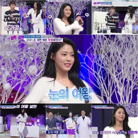 설현은 그의 독보적인 콜라병 몸매가 돋보이는 올 화이트 의상입고 나타나 등장해 시청자들의 이목을 단숨에 사로잡았다. 설현은 색깔있는 것을 싫어하는 눈의 여왕으로 변신한 것. 눈의 여왕 설현은 색깔이 있는 음료를 투명하게 만들어내며 호기심을 제대로 자극했다. 나아가 설현은 시연을 완벽히 소화하기 위해서 AOA 멤버들 몰래 과학자 or 마술사에게 따로 과외까지 받았다고 고백해 스타호스트 설현의 활약에 대한 기대감을 증폭시켰다.