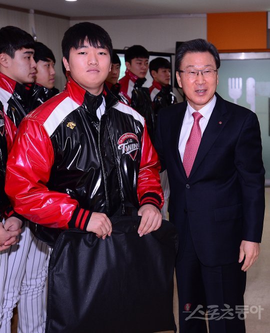 5일 잠실야구장에서 LG트윈스 선수단과 프런트 전원이 참석한 가운데 2017시즌 시무식이 열렸다. LG트윈스 2017시즌 신인 대표로 나온 고우석이 신문범 대표이사(오른쪽)에게 정장을 선물받은 후 기념촬영을 하고 있다.
