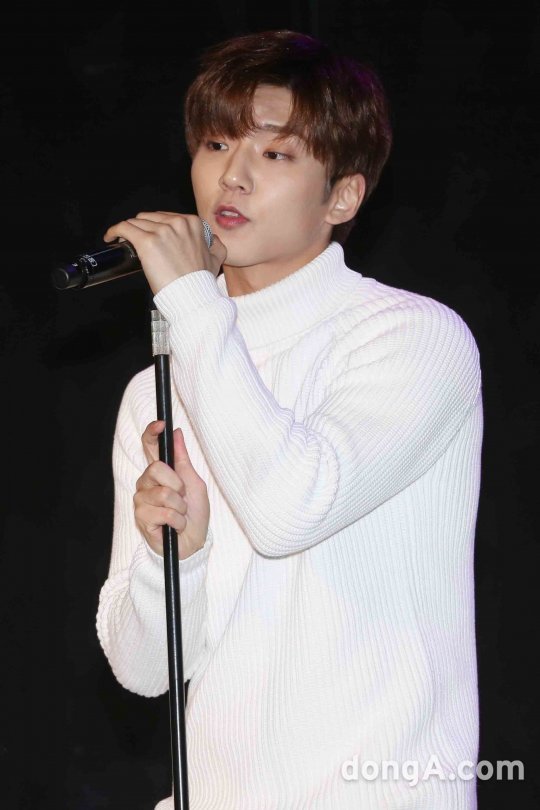신예 4인조 보컬그룹 브로맨스의 이찬동이 5일 오후 서울 마포구 제일라아트홀에서 열린 두번째 미니앨범 'ROMANCE' 발매 쇼케이스에서 신곡 무대를 선보이고 있다.